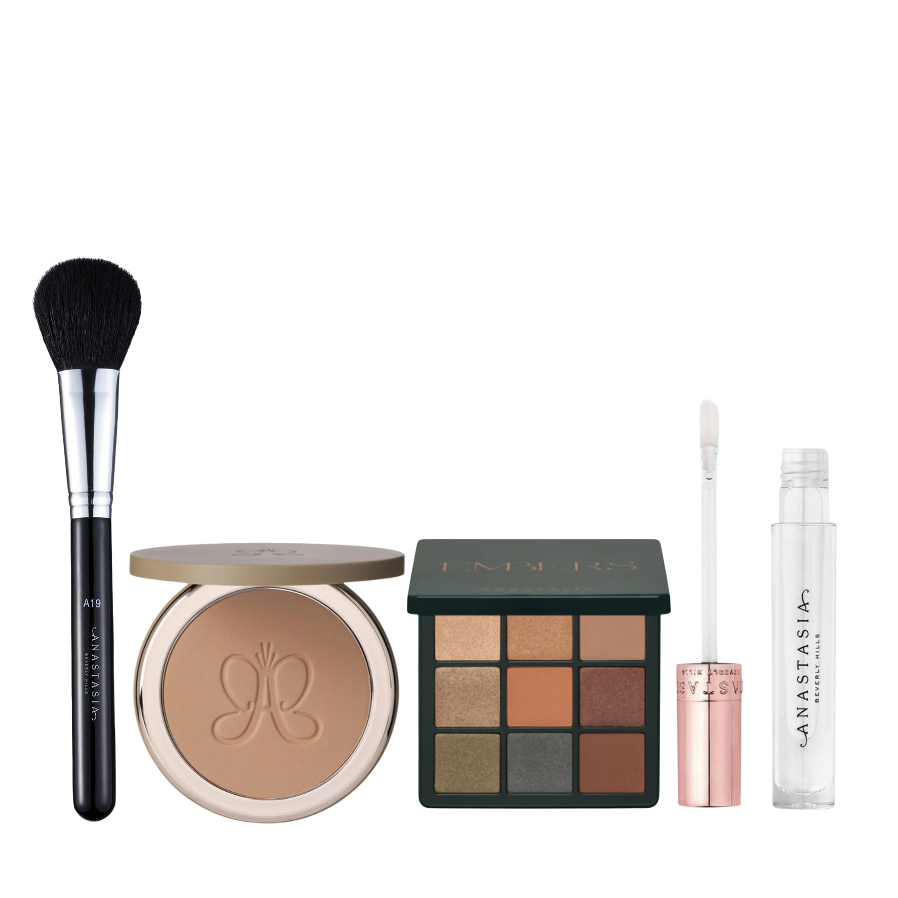 La paleta Embers aporta tonos neutros y profundos para definir la mirada, mientras que el Smooth Blur Bronzer brinda un efecto bronceado suave y difuminado en el rostro. El Crystal Gloss añade brillo y volumen a los labios, y la brocha A19 permite aplicar y difuminar el bronzer o rubor con precisión para un acabado impecable.
