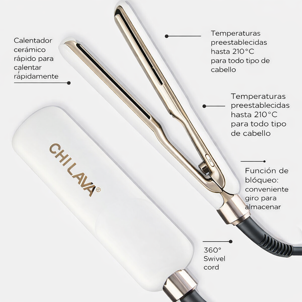 El CHI LAVA Ministyler Iron cuenta con placas flotantes de 1,5" hechas de lava volcánica y cerámica CHI. Esta poderosa combinación ofrece resultados sedosos, brillantes y duraderos. Su calentador cerámico rápido garantiza un calentamiento rápido, mientras que la función de doble voltaje lo hace ideal para viajes internacionales. Con un calor máximo de 410 °F, esta plancha ofrece un estilo conveniente sobre la marcha sin comprometer el tamaño y las características de la placa, comparable a una plancha CHI LAVA tradicional.