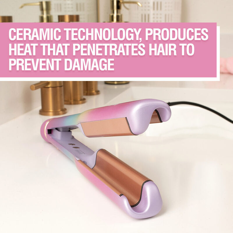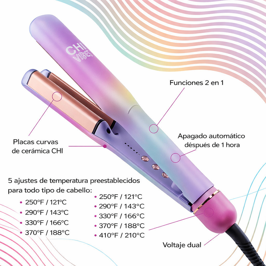 El rizador y rizador multifuncional CHI Vibes "Wave On" cuenta con placas curvas multidimensionales únicas que crean tanto ondas de estilo rizado como rizos playeros sueltos en una sola herramienta. Simplemente cambiando las técnicas de peinado, el cabello se desliza fácilmente sobre una superficie lisa para rizar, mientras que las placas curvas profundas permiten que la herramienta cree fácilmente una textura ondulada. El "Wave On" utiliza una innovadora tecnología cerámica, produciendo calor húmedo que penetra en el cabello durante el peinado para evitar daños.