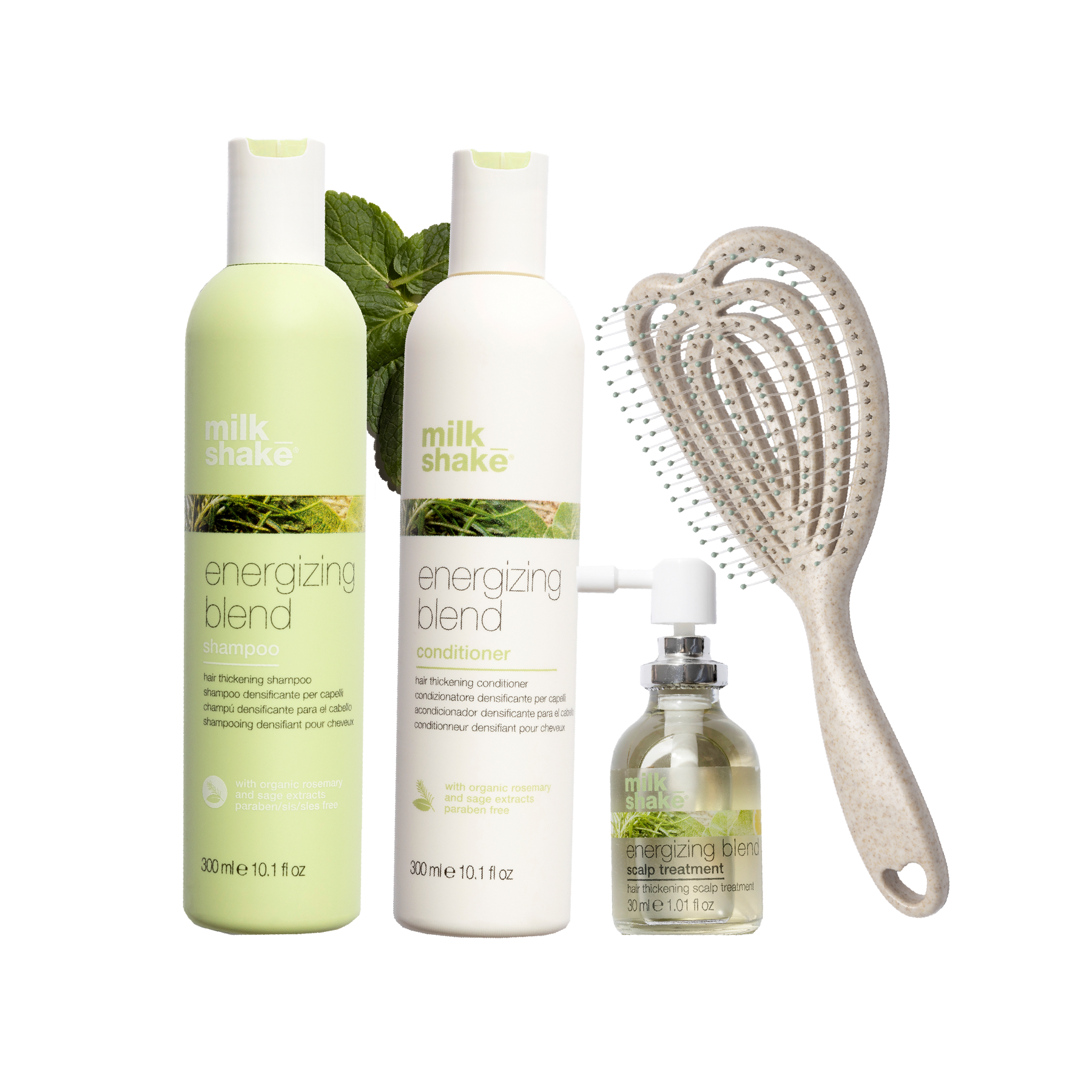🧴 Energizing Blend Shampoo (300 ml): Limpia suavemente mientras activa el cuero cabelludo con extractos naturales como menta y eucalipto.