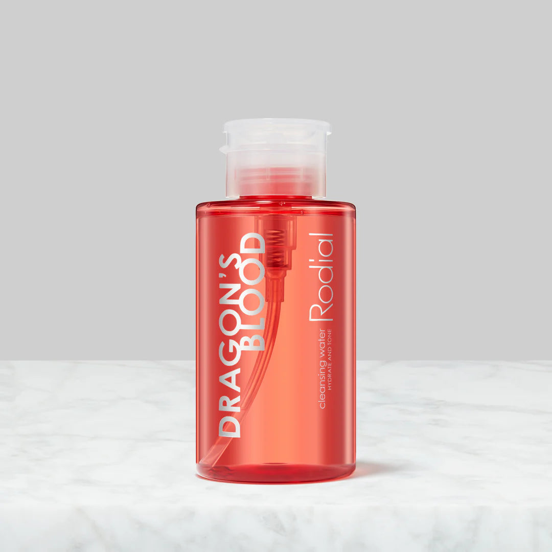 Dragon's Blood Cleansing Water es un agua micelar suave e hidratante para los ojos y la cara, envasada en nuestra nueva botella para llevar. Formulada con refrescante agua de rosas y gotas de aceite micelar, la fórmula elimina suavemente el maquillaje y las impurezas mientras que la sangre de dragón reconforta la piel a través de la hidratación. La vitamina b3 ilumina para una explosión instantánea de energía y una tez más brillante. El ácido hialurónico bloquea la humedad y rellena las líneas finas. Esta fórmula sin apieso y sin enjuague es perfecta para un estilo de vida de ritmo rápido y conjet.